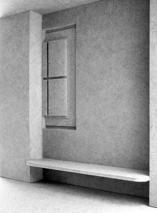 Die Wandnischen im EG und OG sind Aussparungen in der tragenden Sichtbetonwand, die unmittelbar an die bestehende Giebelwand des Altbaus, also der ehemaligen Außenwand angrenzt. Die Schnittstelle zwischen der sichtbaren Bestandsfassade im Westen des Altbaus und dem ostwärts angrenzenden Erweiterungsbau nimmt eine gestalterische Sonderform ein und wird durch die ehemals an dieser Stelle vorhandenen Fenster markiert. Das Fenster als architektonisches Element bezeichnet ein räumliches und zeitliches Fortschreiten. In der gleichzeitigen Bewegung des Rückblicks und des Ausblicks spiegeln sich die Fenster auf den jeweils gegenüberliegenden Flurwänden im Foyer (EG) und in dem zukünftigen Aufenthaltsbereich (OG) wider. Der daraus resultierende Dialog zwischen Alt und Neu, Vergangenheit und Zukunft findet hier seine formale Entsprechung.